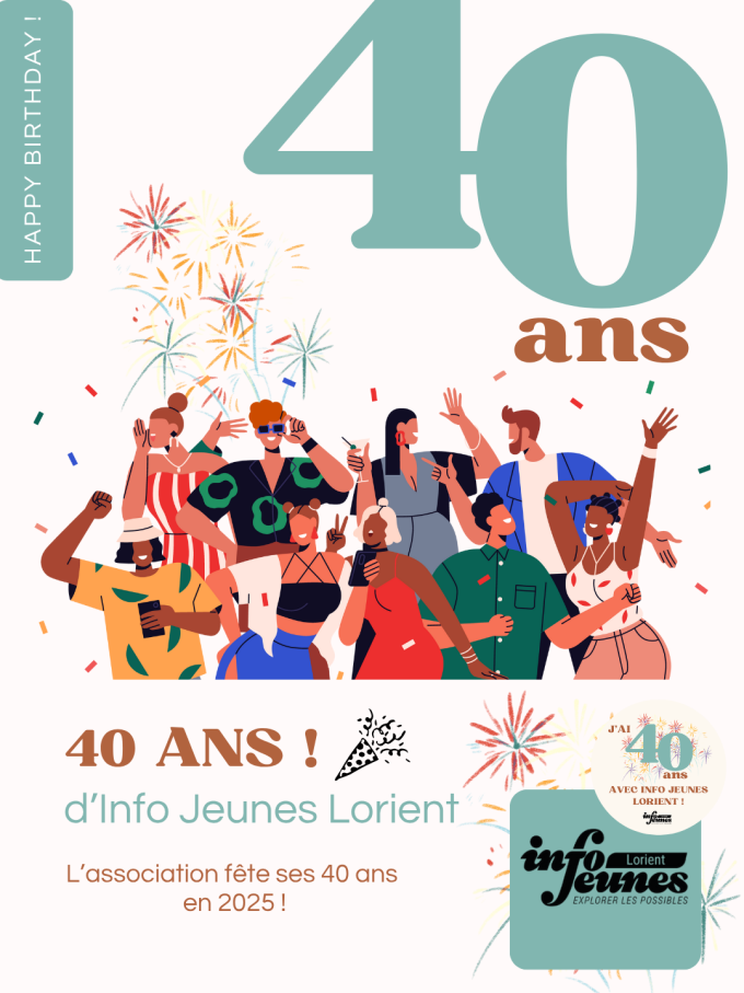 En 2025, nous célébrons les 40 ans d’existence de l’association Info Jeunes Lorient. Depuis 1985, nous accompagnons des jeunes de 15 à 30 ans, issus de tout horizons et avec des milliers de projets ! 😀